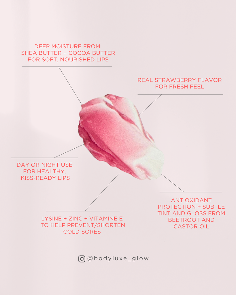 All natural, made with organic ingredients: strawberry or vanilla flavor for fresh vibe, vitamin E hydrates and protects, zinc repairs and strengthens, lysine helps prevent and shorten cold sores. Deep moisture without grease, subtle berry glow.