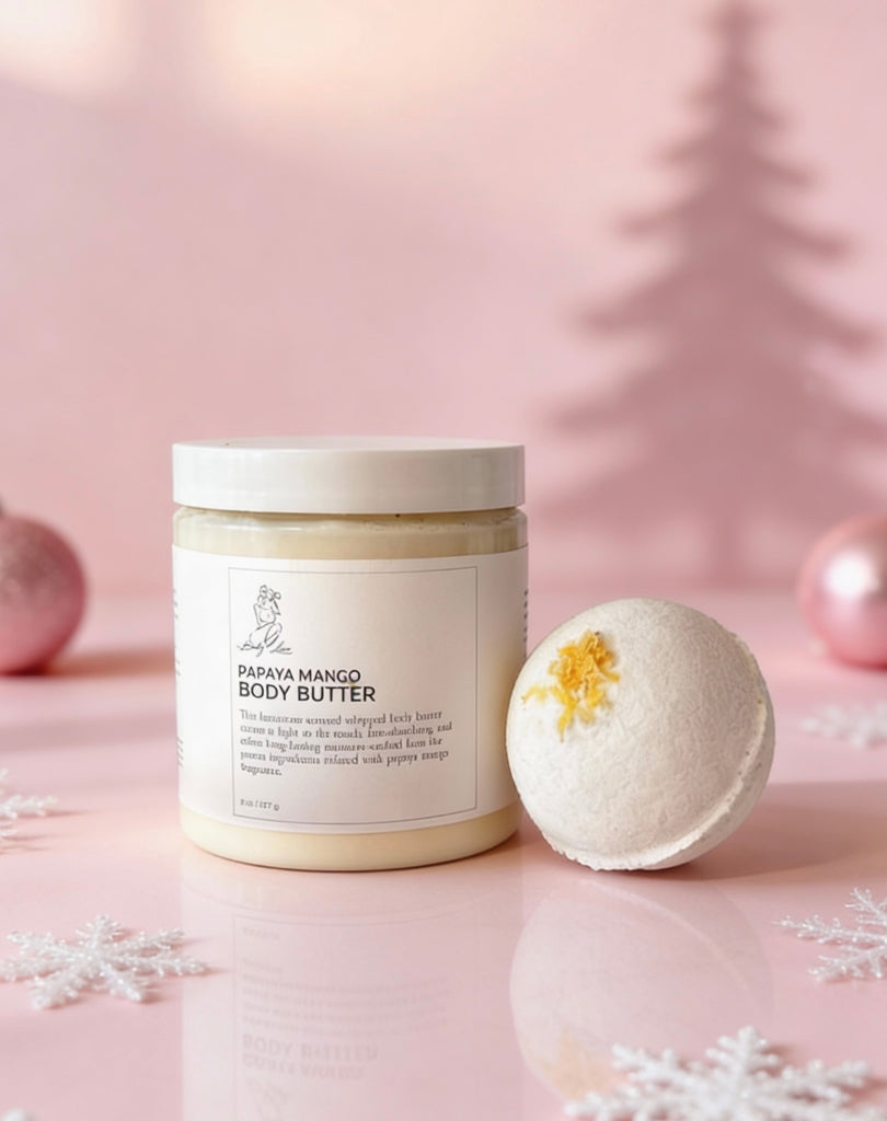 Experience the ultimate in skincare with our Papaya Mango whipped body butter. Light-to-the-touch, it melts in fast and locks moisture, no dyes. Only the gentle, tropical scent of papaya and mango butter. Perfect for sensitive or eczema-prone skin, anyone who wants clean softness. Just butter. Just glow without compromise. Plus a bonus Lemongrass Recovery Bath bomb to fizz away your stress and soothes tired muscles and might include a surprise tiny duck inside.